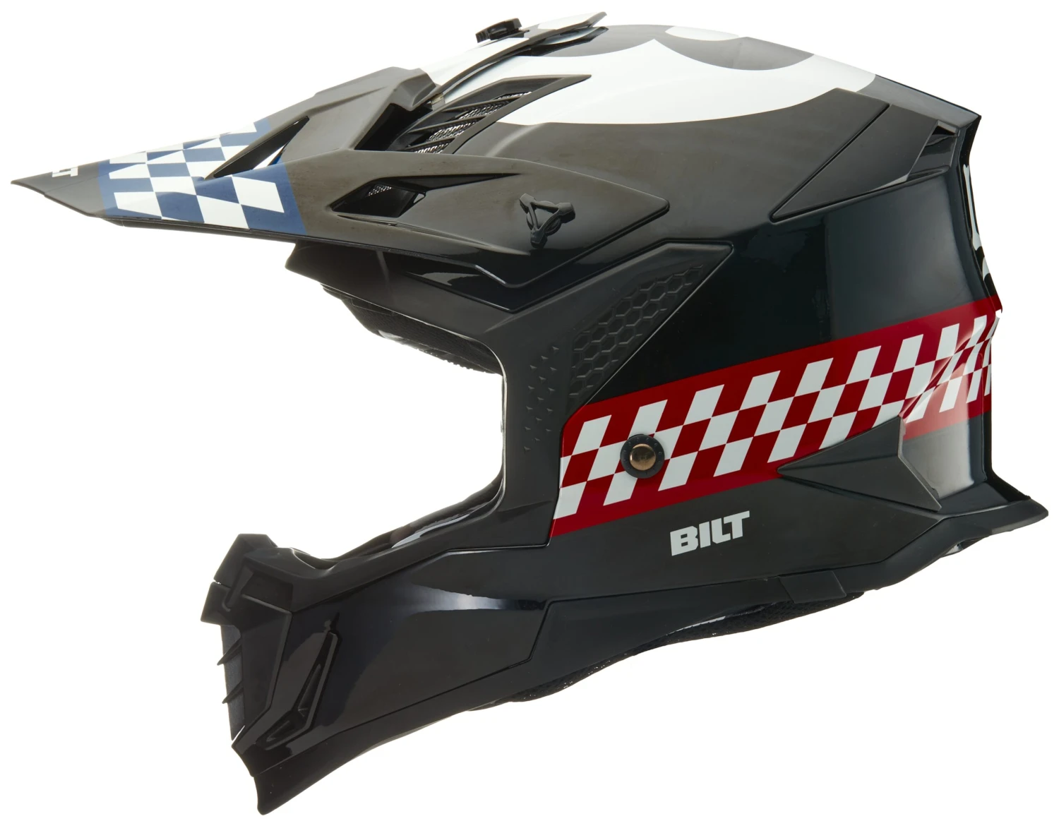 The BILT Lux Sneaky Pete Helmet is a high performance dirt helmet at a winning price. The Lux Sneaky Pete Helmet uses an injection molded ABS shell that is wrapped around a ventilated dual-density EPS liner. Oversized intake vents at the helmet’s chin bar and crown are matched with exhaust ports at the rear. The liner and cheek pads receive their own unique graphic treatment and are uniquely engineered for comfort and airflow – keeping you cool and focused. The aero-tuned sun peak is fully removable, and the Lux receives both DOT and ECE safety certifications.