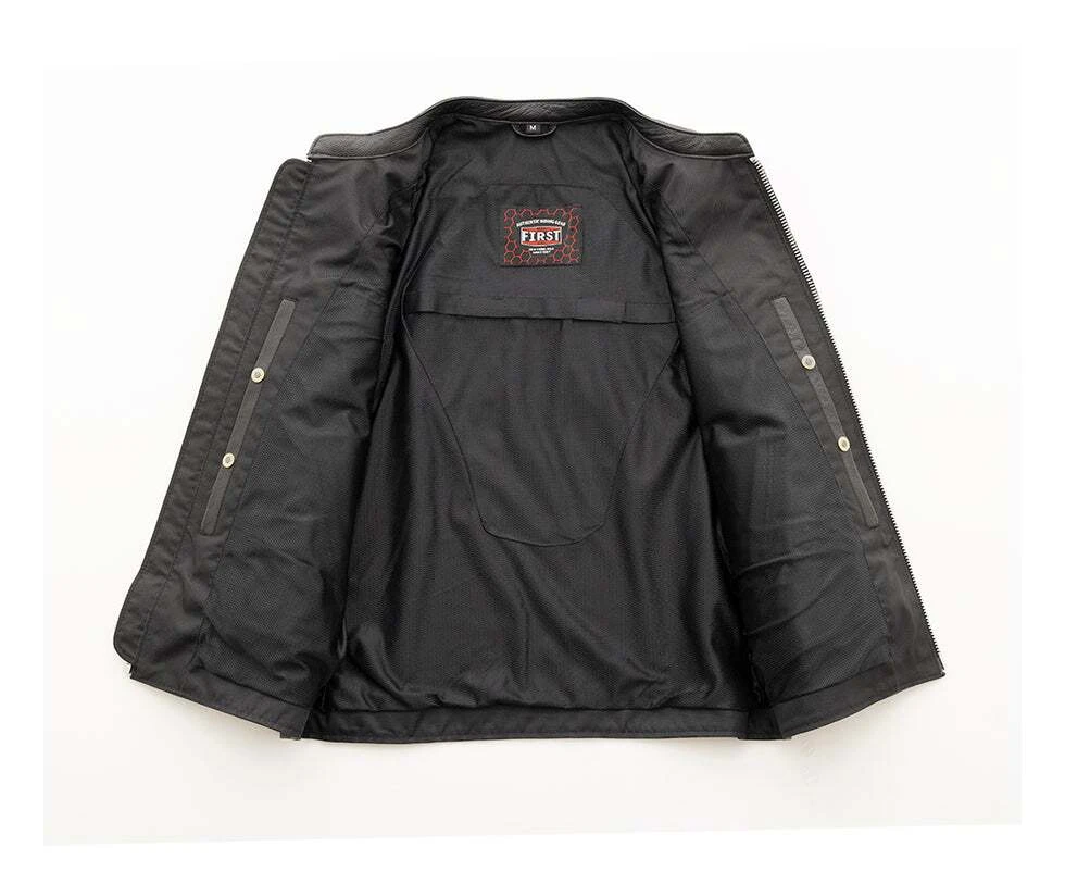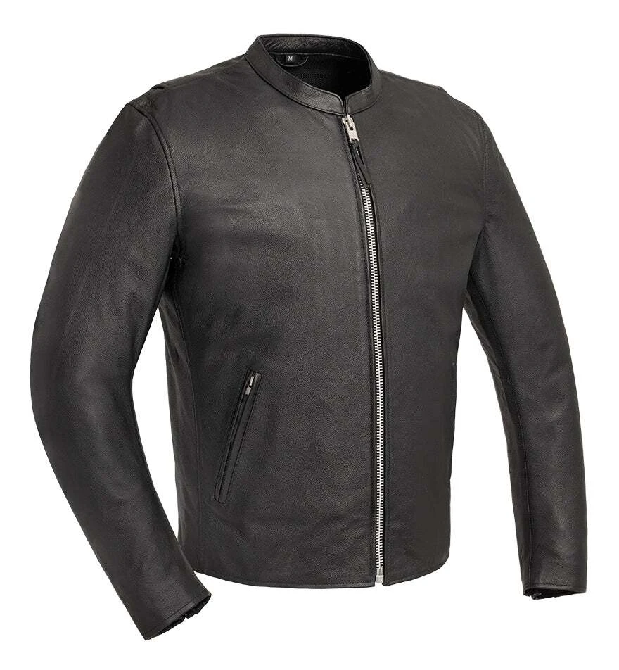 The First Manufacturing Titan Jacket is a simplistic jacket with a clean center zipper style and zero upper chest pockets. Inside, there are two interior pockets and armor pockets for CE rated armor (sold separately). Order the same size as your t-shirt for the best fit.