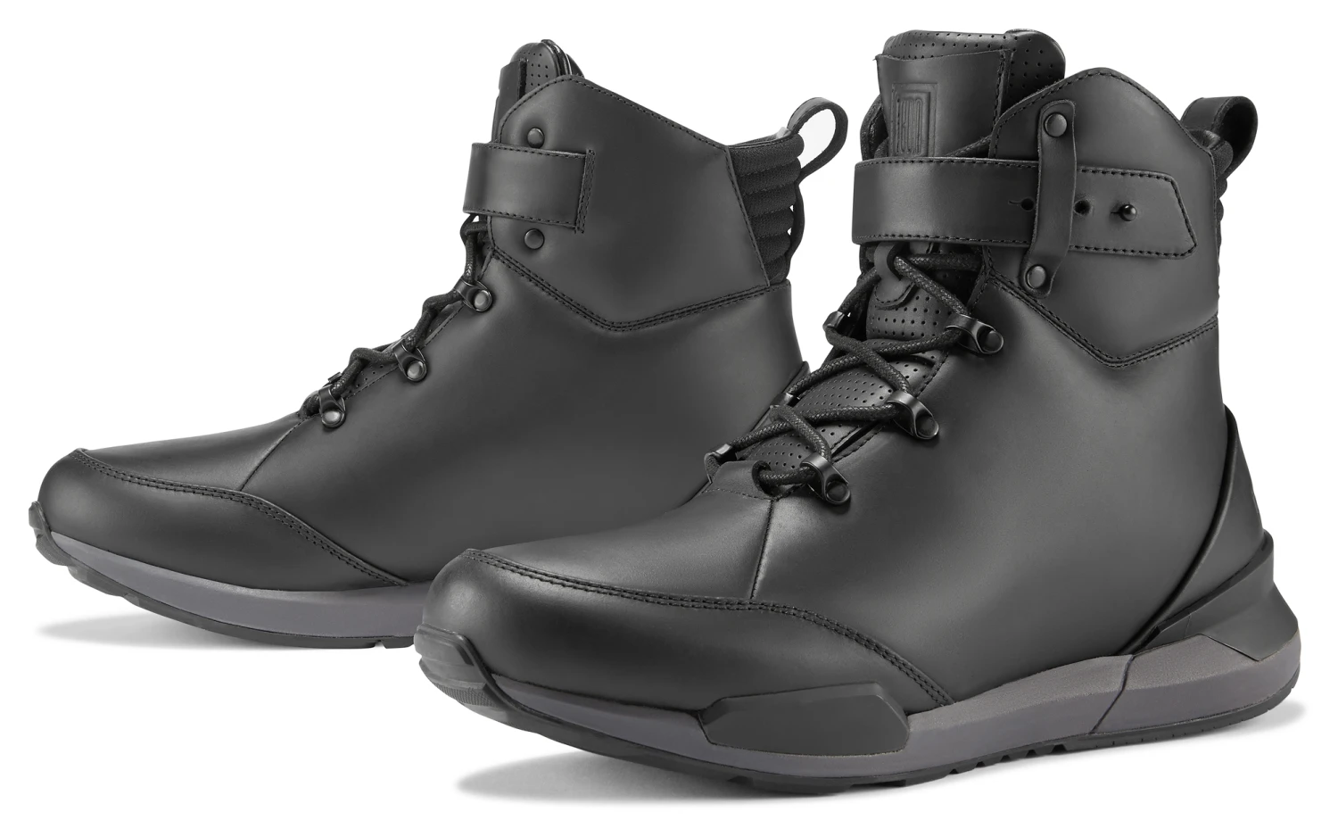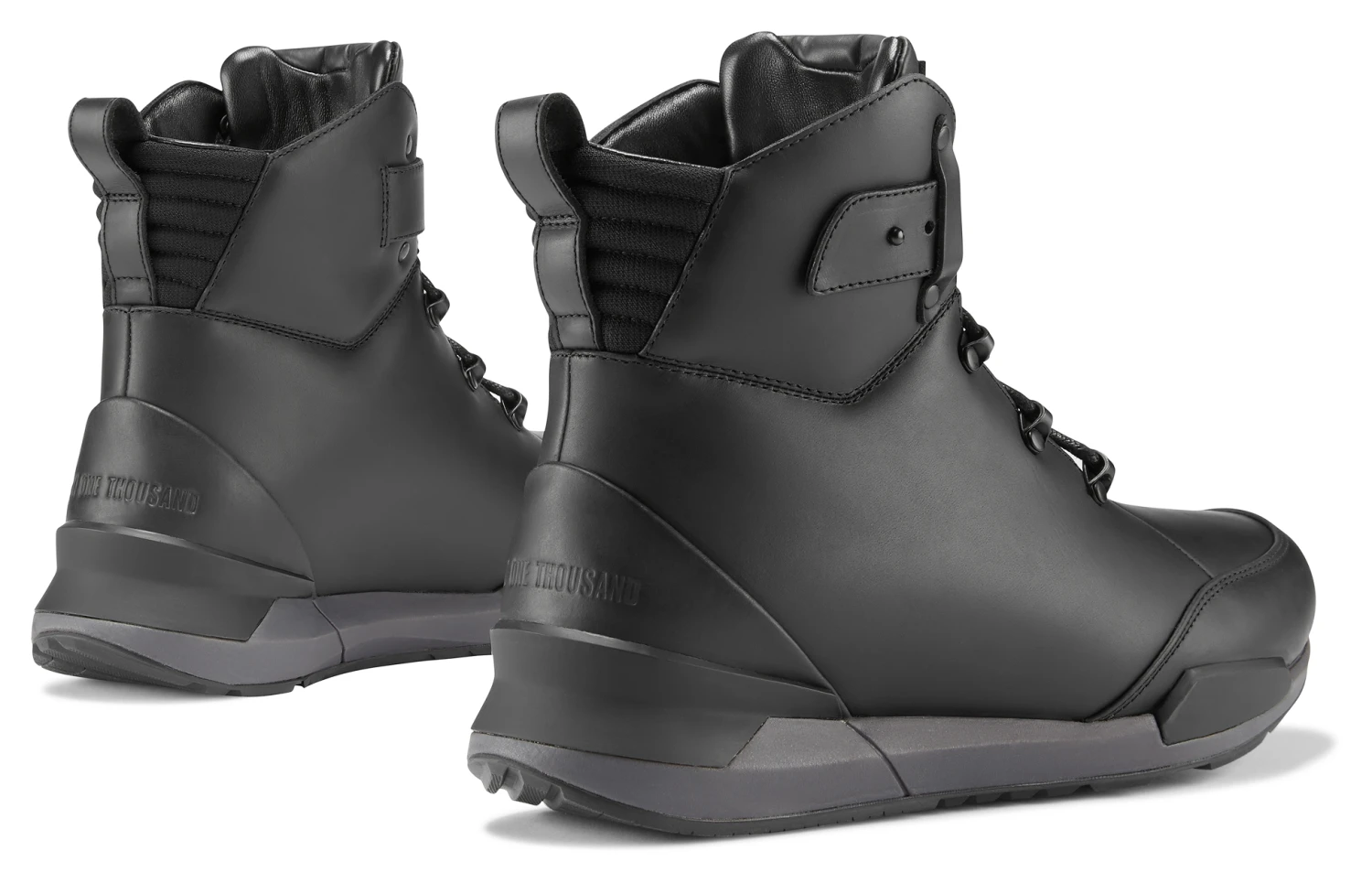 Ollie up! Your skateboarding days may be behind you, but your kicks can still pop shove-it with the best of them. The Icon 1000 Varial are a leather high-top shoe that look as good on your bike as on a b-ball court. D3O inserts in the ankles for impact protection and a strap that covers the laces complete the style.