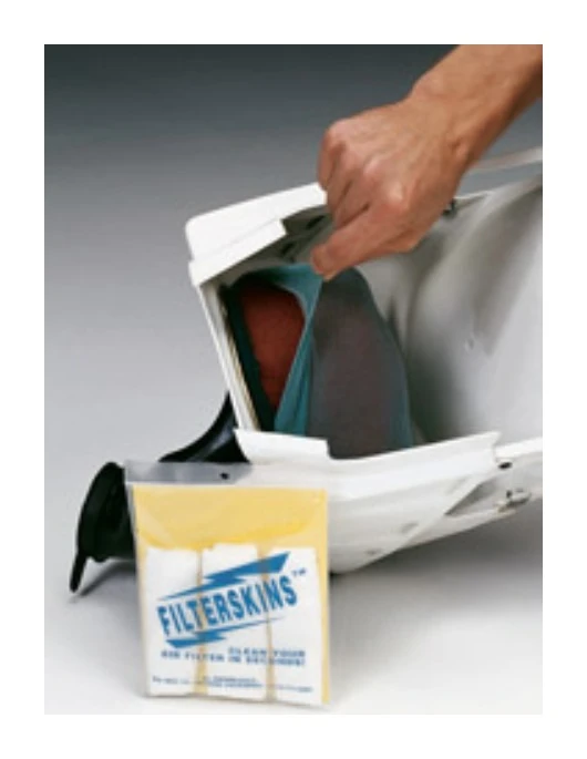 Filterskins are an extremely thin but durable air filter cover. While allowing maximum airflow, a lightly oiled Filterskin will catch 90% of the dirt that tries to pass through the air filter. Between races or between rides, simply pulling off a dirty Filterskin and sliding on a clean one can save you time and actually save money on expensive solvents and oils. Filterskins are extremely elastic and each size will expand over a wide range of air filter sizes.
